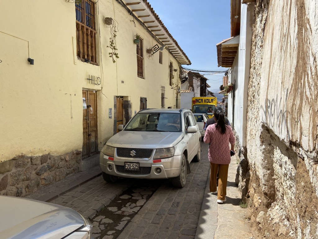 There is also no one-way system on these narrow streets – I witnessed a very amusing stand-off earlier in which three cars had already got stuck in a row all going different ways, and just as the car positioned alongside the pedestrian in the below photo was trying to reverse to allow the car facing him to proceed (the car behind him was just about to drive out forwards), a van drove in and completely blocked the road! I saw a passenger sat in the car at the back with the window down and joked to him about how crazy the situation was – he told me the crazy thing is it happens all the time!