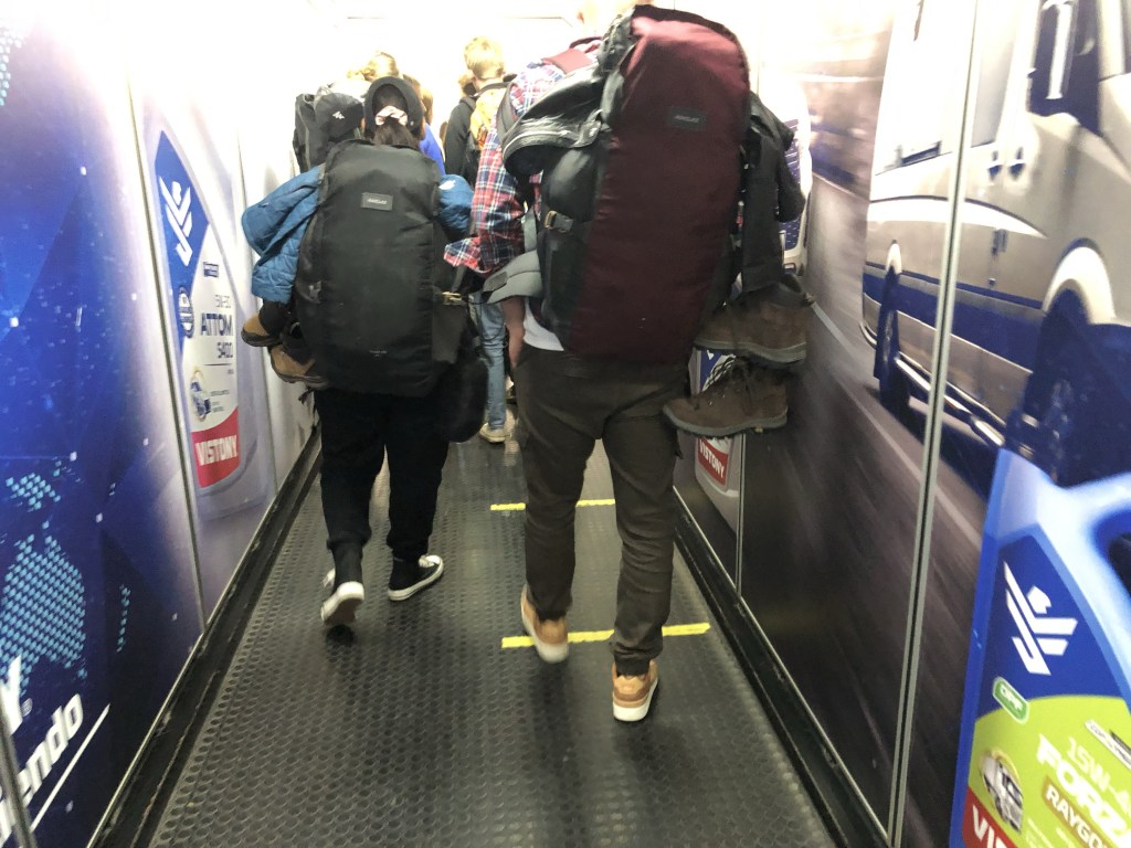 I was interested to see, when boarding, just how relaxed the airline was about cabin baggage. You’re allowed one personal item in the cabin for free – this can be a handbag or a small rucksack (which is what I have) small enough to fit under the seat in front. But you can pay for an extra carry on bag and while in theory the size of this bag is limited, in practice there seems to be loads of leeway given. I saw plenty of people boarding with huge rucksacks with boots and sleeping bags hanging off the sides, and this didn’t seem to perturb the cabin crew at all.