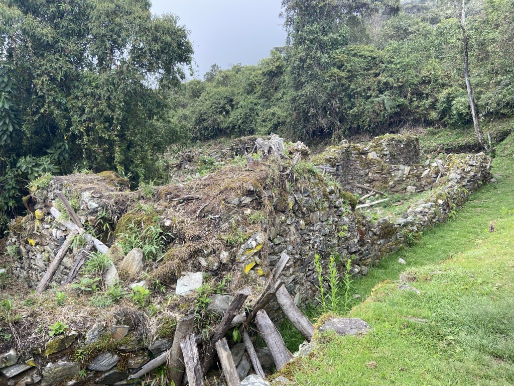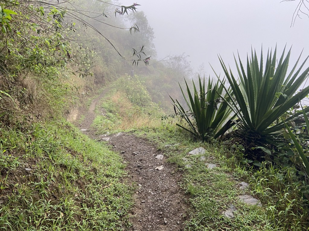 Day 4 was simply exhausting. I had by now completely recovered from any stomach and altitude related issues and thankfully was not having any real problems with my knees, but a number of the group were hobbling with sore knees and feet, and a few had been struggling with nausea and other digestive issues. We started the day with a 700m climb through a forest on a section of the original Inca trail – followed by a 700m descent down the other side of the pass. It was raining and very humid – the track through the forest was beautiful with coffee plants growing at the side of the track and plenty of other lush vegetation, but the highlight of the climb was a stop at a picnic spot shortly before the top, where the owners had installed a couple of swings on which one could swing out over the tree tops into the cloud – great fun!