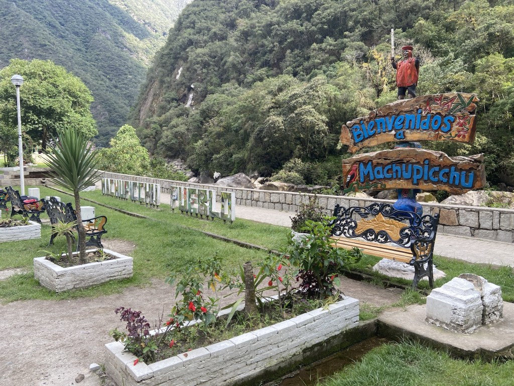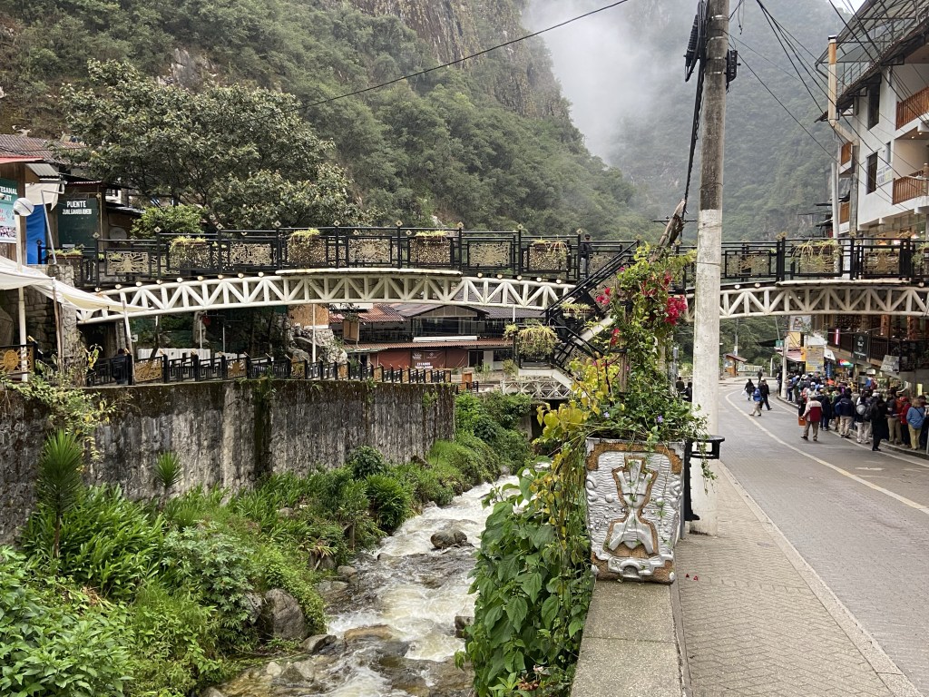 The final 12km alongside the railway track to Aguas Calientes felt endless. It’s all flat but it was baking hot by this stage and we were all just ready for the hike to be over, with some members of the group visibly hobbling with assorted foot and knee problems. We eventually did arrive, however, and I was charmed by what a beautiful village Aguas Calientes is, with a river running through the middle, bridges adorned with hanging baskets, ornate street signs, and Inca statues in abundance.