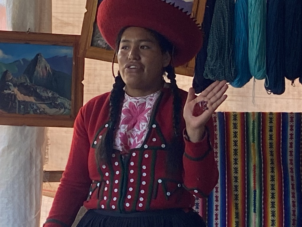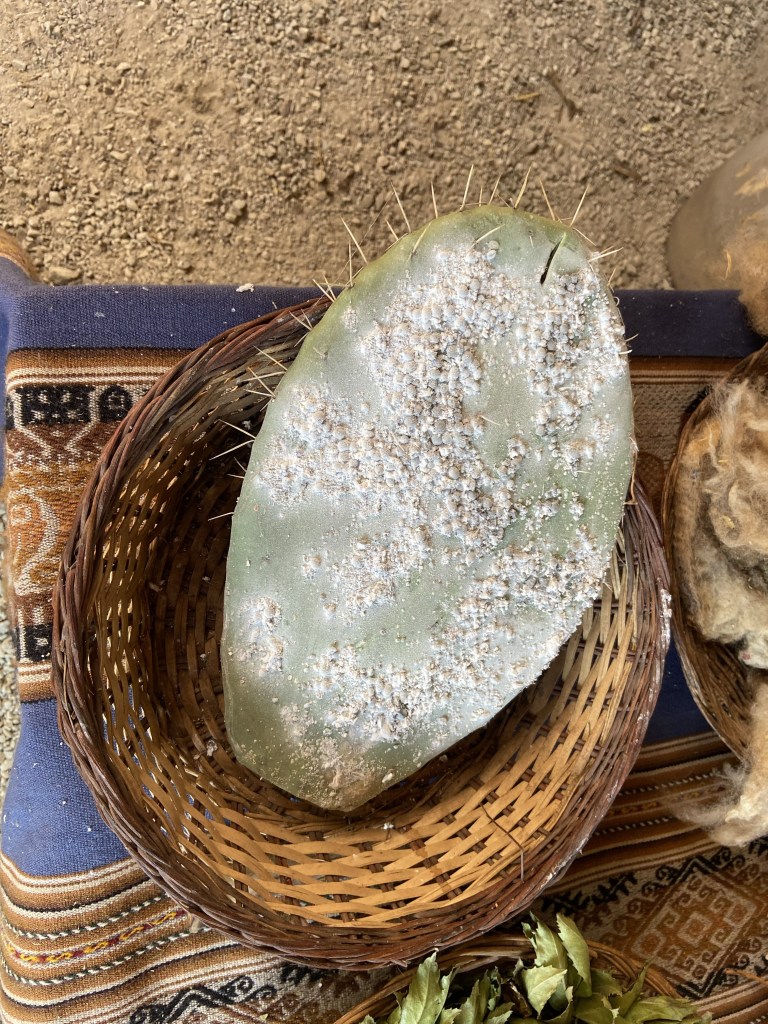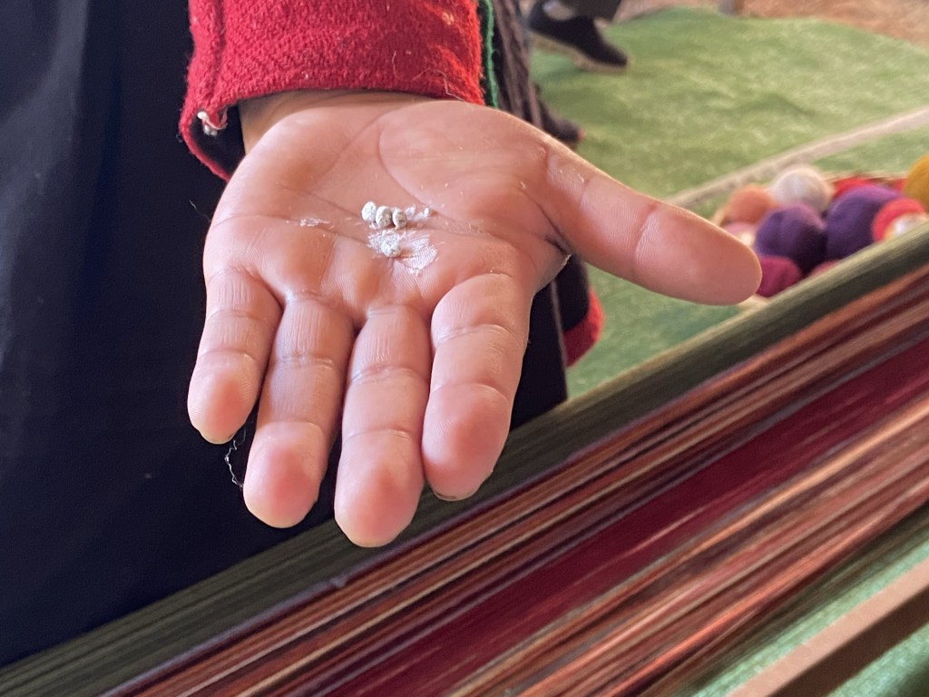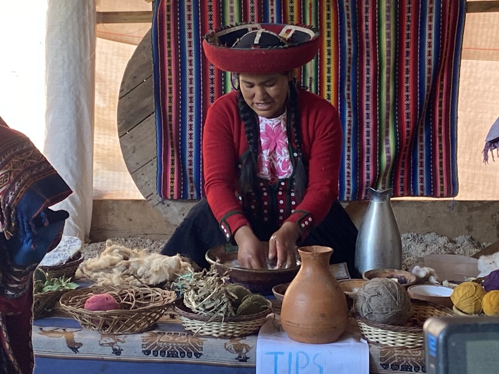 As for the trip to Moray and Maras, despite feeling fairly queasy, that was great. We went, first, to a textile outlet in Chinchero where a lady gave a fascinating demonstration of how they use natural materials to clean and dye wool – she showed us a type of plant root that, when grated into water and mixed, produces perfect soap suds which are first used to clean the wool. She then showed us the different plants they use to produce different colours – and a tiny parasite that grows on cactus leaves, which, when crushed, produces bright red dye – and how adding a tiny bit of lemon juice to this then changes the colour to a bright orange.