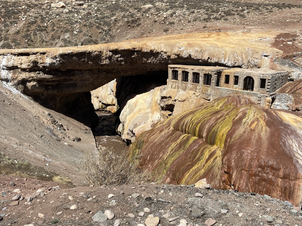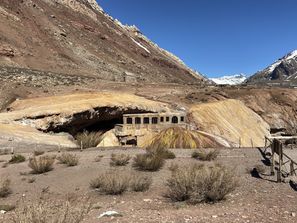 Just before Aconcagua, we stopped at Puente del Inca, which is a fascinating natural bridge formed by colluvial sediments and salt deposits. There was once a luxury hotel above the bridge where people could stay and enjoy the natural thermal waters, but this was destroyed by an earthquake in 1965 and never rebuilt. There is now a small collection of shops selling food, drink and tourist trinkets to the bus loads of visitors who turn up each day to see the bridge.