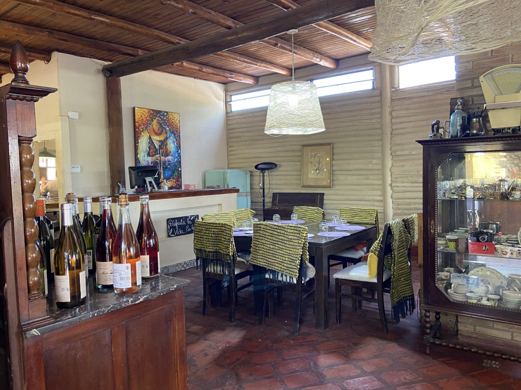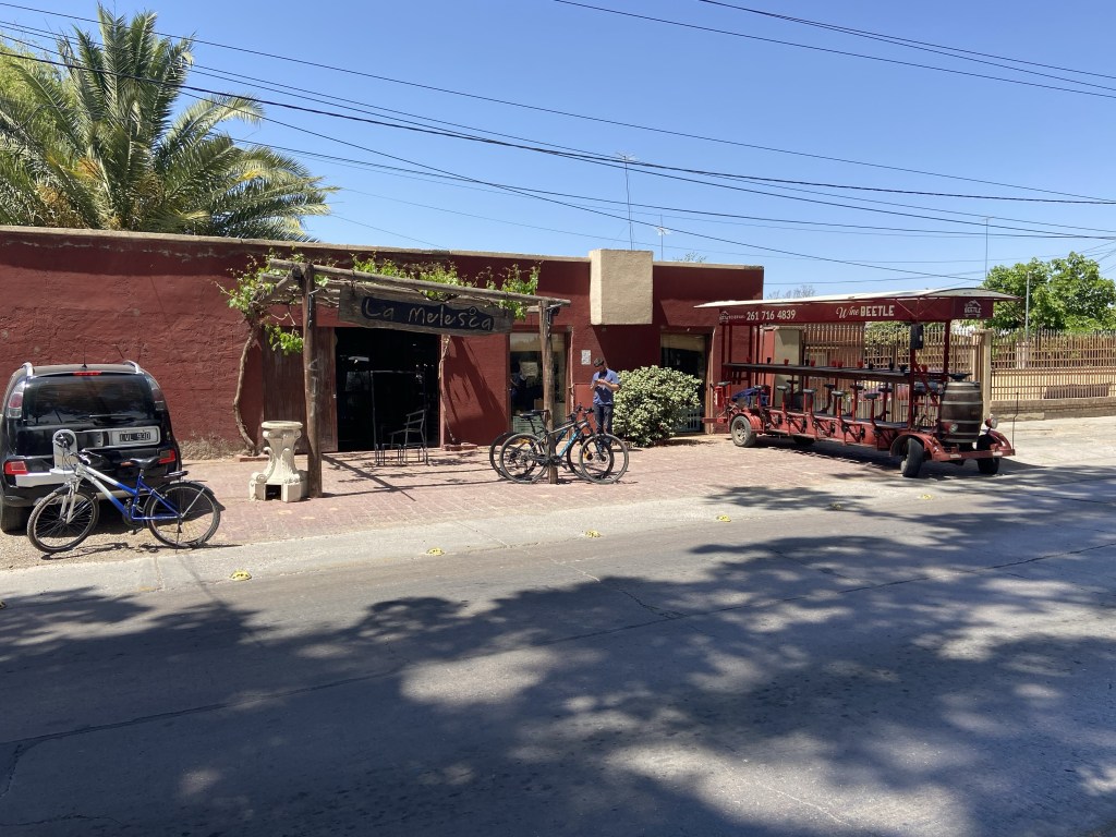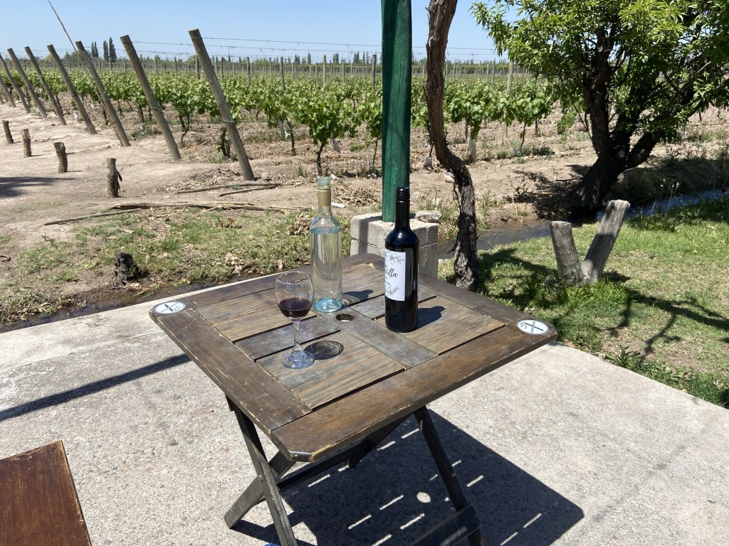 There was a fair-skinned couple sat at a table nearby in the garden, and I’d been wondering if they were English-speaking, when she came over to say hello. She had heard me speaking English to the waiter who had come over to check how I was doing – it turned out she was Scottish, and her partner American, and they were also on bikes, but they had cycled all the way from Mendoza! It’s not actually very far – only about 10 kilometres – but there is no way I could have cycled to and from Mendoza on the dreadful bike I was riding! Their bikes did look a bit better than mine, though. She told me they had been stopped by the police on their way to Maipu and warned that the area they were cycling through was not safe and they were at risk of being robbed – the police apparently insisted on escorting them, blue lights flashing. to a safer road! She told the story with great amusement and relish at having such an adventure in her 60s!