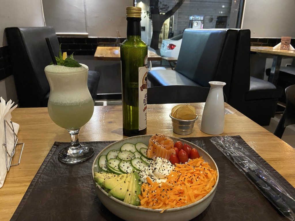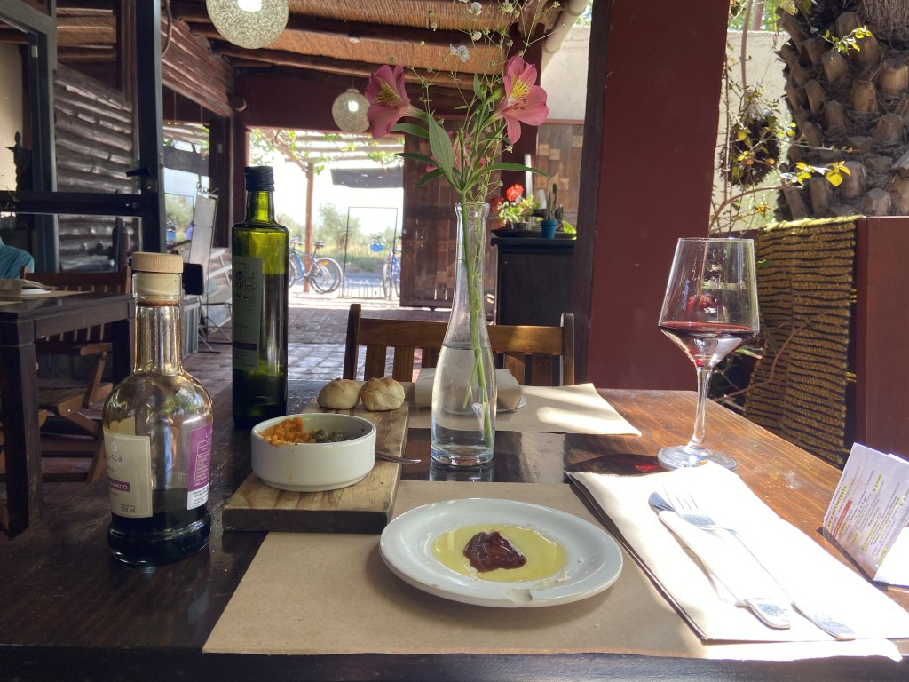 I was seated at a lovely table on the patio next to the garden, and when the waitress asked if I’d like to try the olive oil tasting I said yes. She brought me a delicious glass of Malbec – the best I’d had so far – and then brought over a dish with 6 mini bread rolls and some tapas, and poured some extra virgin olive oil onto a plate, indicating that I should try the oil with the bread. I tried it – it was delicious- and she then poured some balsamic onto the plate and indicated I should try this. Once again, delicious. I was then invited to mix the two and pass judgement on which was better – the oil alone or the mixture. I said I preferred the mixture, she seemed happy with that pronouncement, and then left me with both bottles to finish the rest of the bread and the tapas at my leisure.