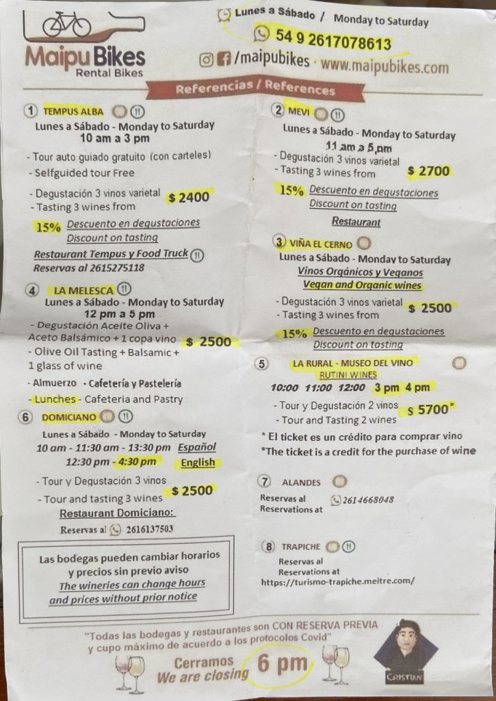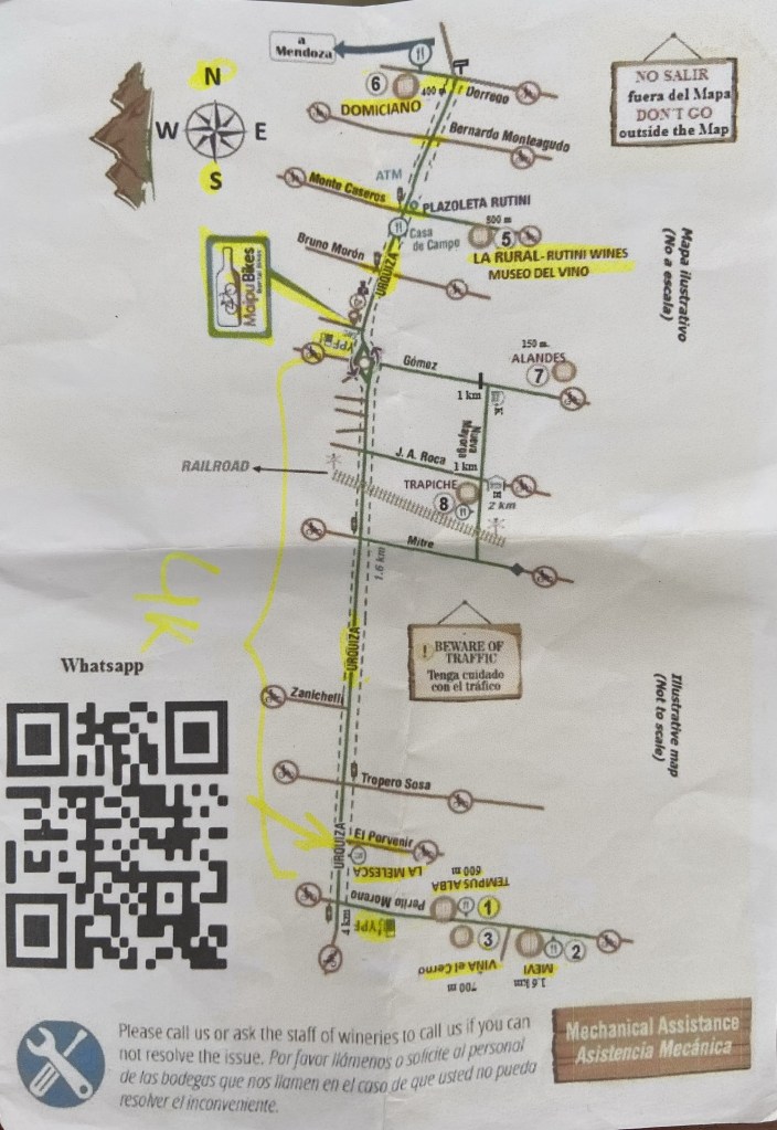 I walked in, said I’d like to hire a bike and was immediately invited to sit down while a young man produced a map and proceeded to explain to me – in English thankfully – the very simple route to the various wineries, and the costs of the different tasting options at each. The shop shuts at 6pm, so bikes have to be back by then, but I was encouraged to arrive back by 5pm to enjoy happy hour with wine and empanadas!