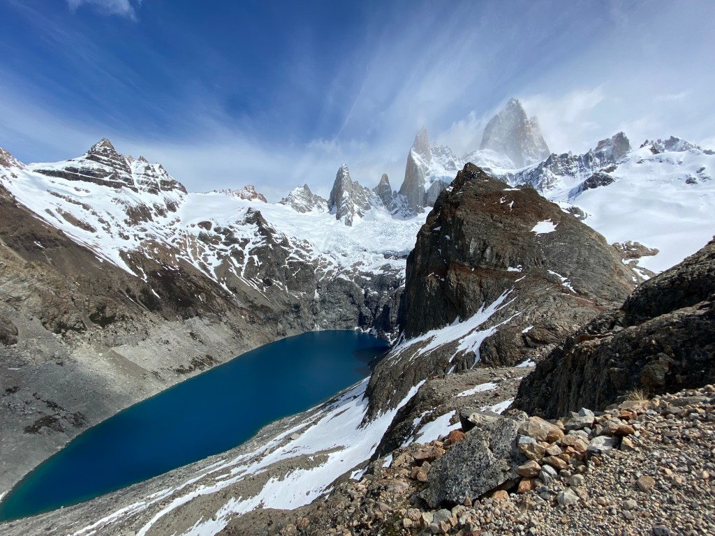 The views are worth the slog, and for those who venture up the small hillside to the left of the Laguna de Los Tres, there is an added reward of seeing another lake, Laguna Sucia – unlike Laguna de Los Tres which was heavily frozen, Laguna Sucia is a glorious blue.