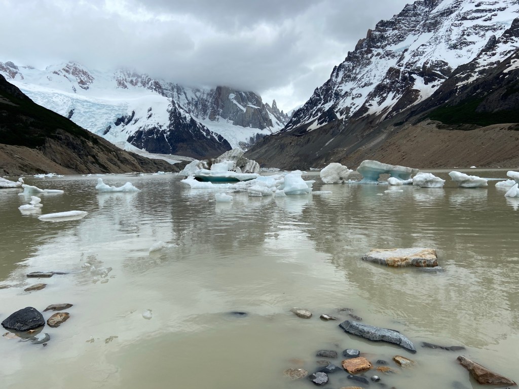 Day 2, yet again there was no rest for the wicked as I headed out to do the slightly shorter (18k) but much easier hike to Laguna Torre. This is a gradual ascent pretty much the whole way up, mostly through forest, with lovely views of Fitz Roy on the way up. Sadly by the time I reached the Laguna the cloud level had dropped, so Fitz Roy and the nearby peaks were no longer in view, but I was still able to appreciate the lake with all its floating icebergs.