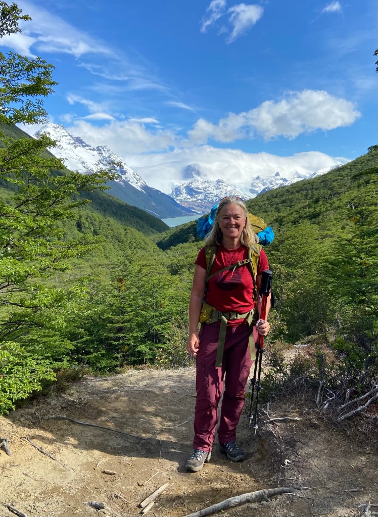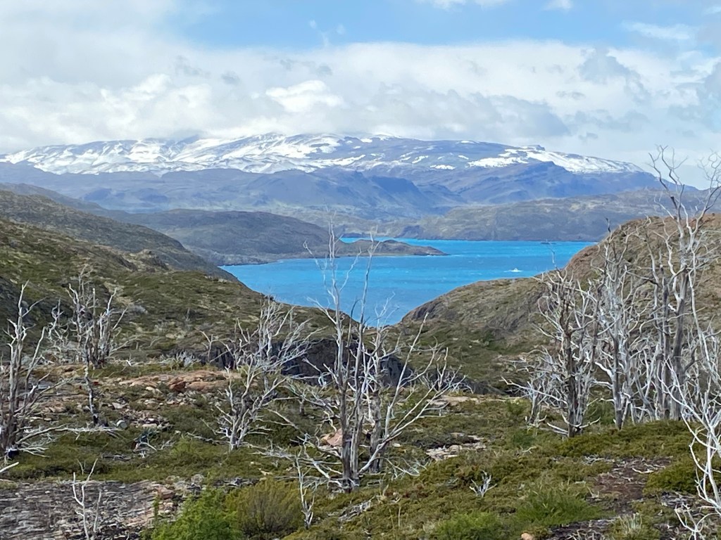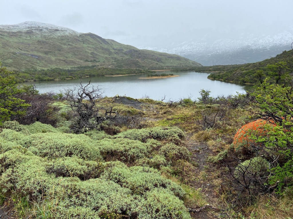Overall it was a really enjoyable walk; 11 miles which took just over 5 hours. The scenery was beautiful and constantly changing, with our first sighting of snow as we headed up the hillside, lovely views of partially clouded-over mountains and a glacier, Lago Paine, a beautifully curved boardwalk over some wetlands, occasional painted boards telling us what plants we were seeing, and then eventually, as I came around a corner, suddenly I was treated to a stunning view of Lago Dickson with Dickson Camp nestled in the bend. The rain had stopped after about the first hour, and it was gloriously sunny by the time I reached the camp, with a lovely view of the hills from my tent.