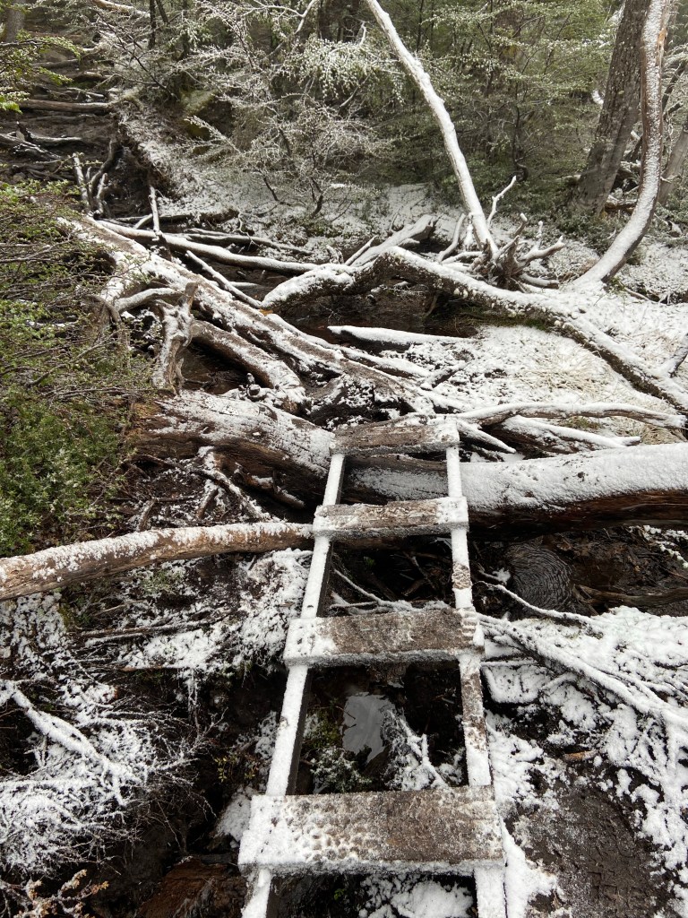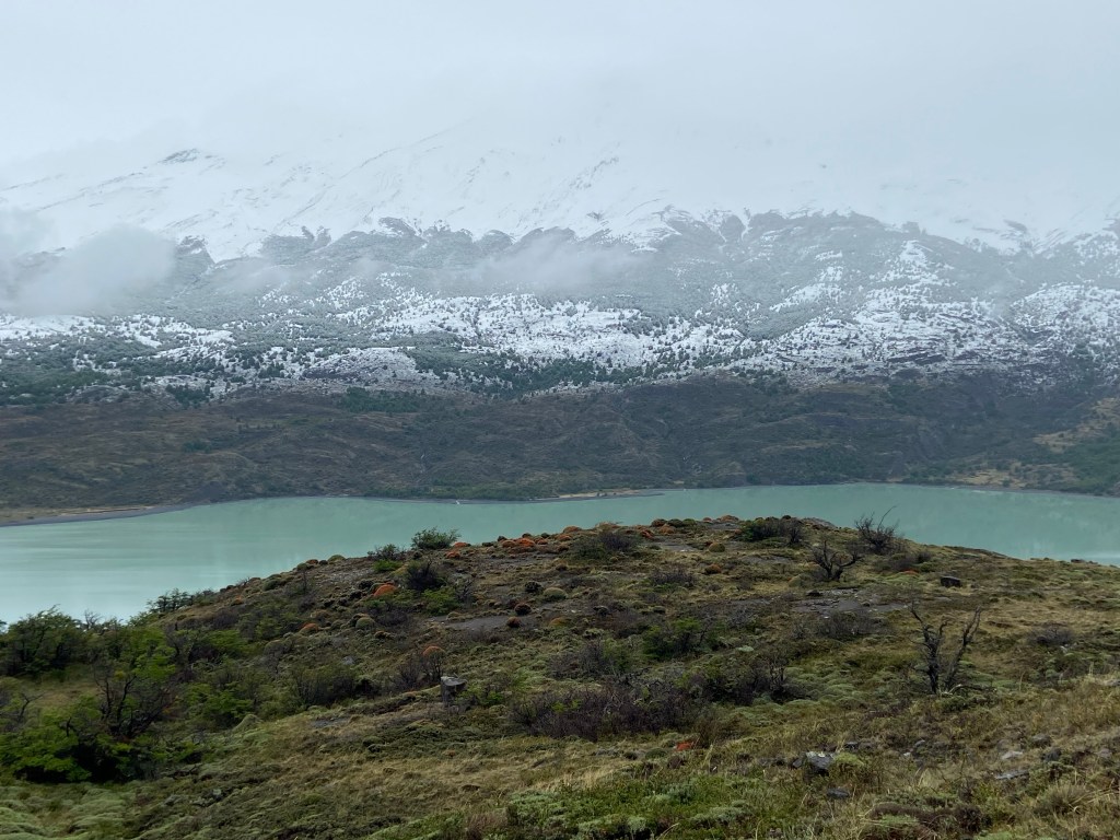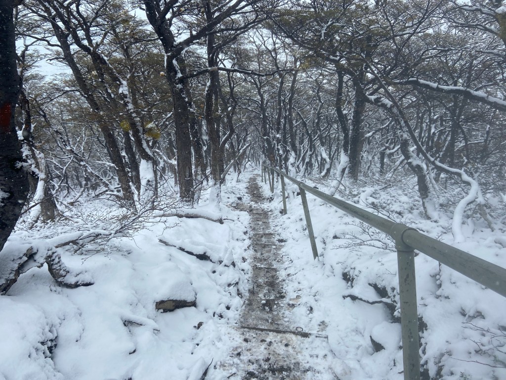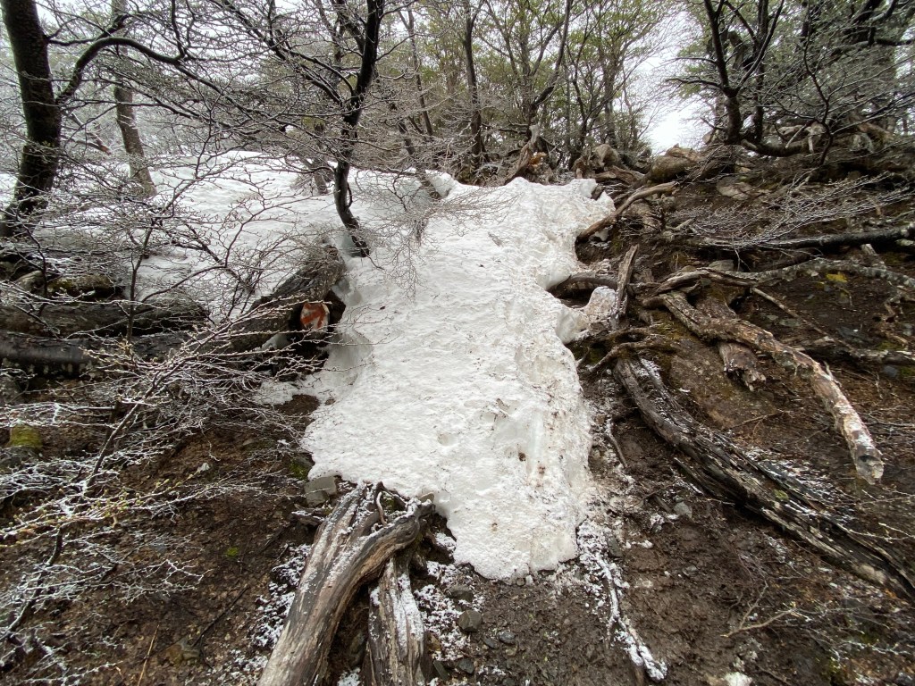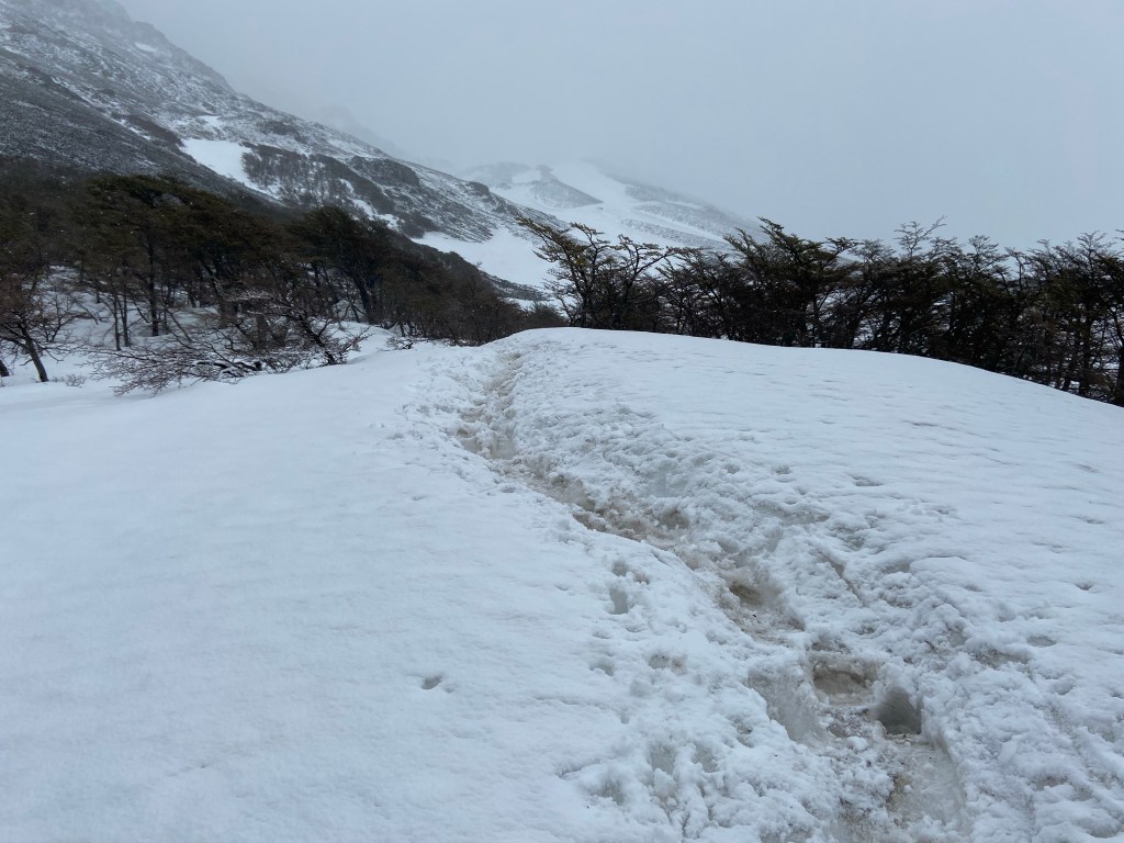 I was up early as my roommates (3 very nice German ladies) had been up and moving around at 6am – it was their final day on the W Trek and they had a long day planned. I hadn’t been able to book breakfast or packed lunch so was packed and ready to go by 7.30. I initially had hoped to do a side trip to Mirador Britanico before heading to Central, so left my heavy rucksack in a shelter at the campsite and started to hike back in that direction, but within 15 minutes it started to snow, and seemed to be getting heavier, so I turned round and headed back to retrieve my rucksack and carry on to Central. I realised once back at Frances that the chest strap had fallen off the backpack – I briefly thought about giving it up as a lost cause, but it’s fairly crucial to keeping the pack straight on my shoulders, plus, it being a rental rucksack, I didn’t want to return it missing the strap. So there was nothing for it but to put the rucksack back down again and walk back down the steep hill to look for the strap, as I knew it had to be somewhere in the vicinity of the refuge – thankfully I found it on the ground just outside the bar where I’d checked in. But by the time I’d hiked back up the hill to once again retrieve the rucksack, I realised just how knackered my legs were and decided it was a good thing the weather had prompted me to turn round, as I simply didn’t have the energy for the side trip to Britanico.