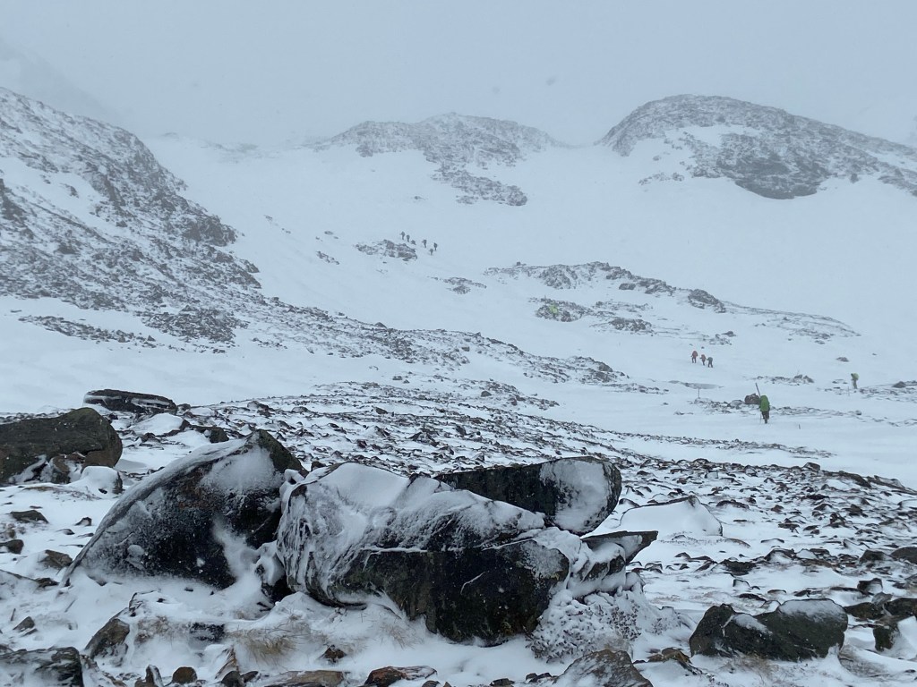 Initially they worked well, as we were walking up a clear, well-trodden trail, but as we got higher the snow got deeper, and although we were all trying to walk in the footsteps of other hikers, often a step would collapse, causing one’s leg to plunge thigh-deep into the soft snow, with the added weight of the heavy rucksack making it more difficult than usual to get out. And in this deep snow, suddenly my spikes kept coming off. I would notice one had fallen off and then have to backtrack through the deep snow to find it. After this happened a few times I decided to stop to take them off and put them away, but in the process lost sight of the rest of the group (although we were not walking as a cohesive group, everyone had set off from camp by 7am as we’d been directed to do, and everyone was headed in the same direction so had been following the same route, so until this point it had been easy to just follow those in front). But it was snowing heavily by now, and the strong wind was blowing snow straight into my eyes; I couldn’t see more than a couple of meters ahead. I didn’t have goggles so had put my sunglasses on, which provided some protection for my eyes but did nothing to improve visibility.