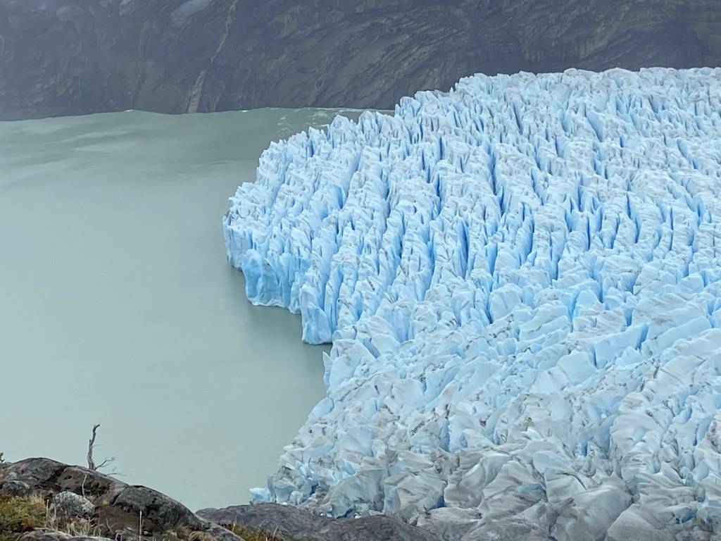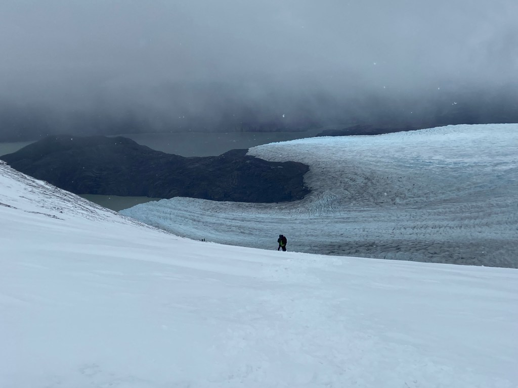 Miraculously, as soon as we started to drop down the other side, the wind dropped and visibility improved. Despite the gloomy conditions we could still make out the vast expanse of the Grey Glacier spread out below us.