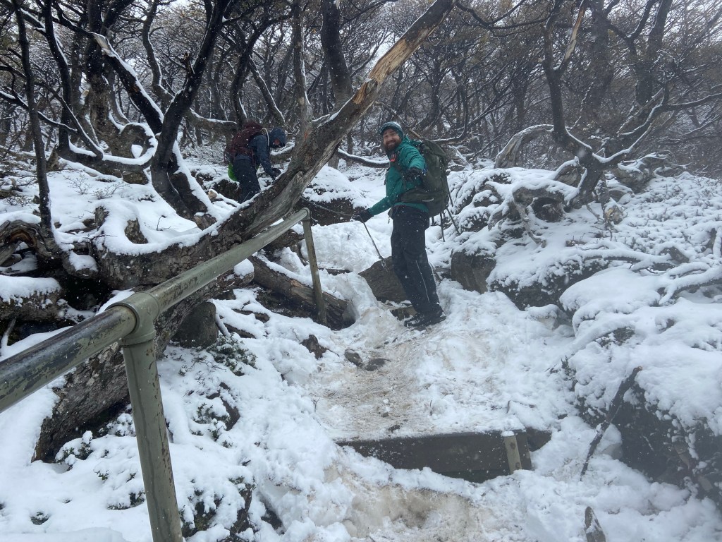 This day will live on in all of our memories for years to come. We all expected a tough day, as we needed to get over the John Gardner Pass, which, despite not being that high at only 1220m, is notorious for strong winds and is known to be the toughest part of the trek. It was snowing lightly as we left the camp, and initially it was quite exciting seeing the snowfall. The lower section of the trail was very muddy, with lots of makeshift log and stone crossings – but as the path continued uphill we suddenly hit the snow line, so I stopped to put on the spikes I’d hired.
