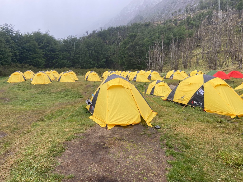 I found my tent, unpacked, had a lovely hot shower and then dinner. This was the best and largest dinner we’d had thus far – all dinners tended to consist of soup, a main and a dessert but at Grey we had a buffet with a choice of tomato or beef soup, and a main of either chicken, beef or stuffed peppers, all accompanied by mash, vegetables, and various salads. And 4 different puddings in a chiller cabinet from which we could help ourselves to whatever we fancied. After dinner it was straight back to the tent to lie down and rest my tired muscles – though as I went to brush my teeth at about 9pm I bumped into Laura and Jen. They, along with Leanne and a few others, had eventually struggled into camp around 8pm! It was wonderful to see that they had all made it, though Jen thought there had been a few people behind them who may have been turned back. Everyone I knew was accounted for though. I slept surprisingly well considering it snowed, rained and howled with wind all night.
