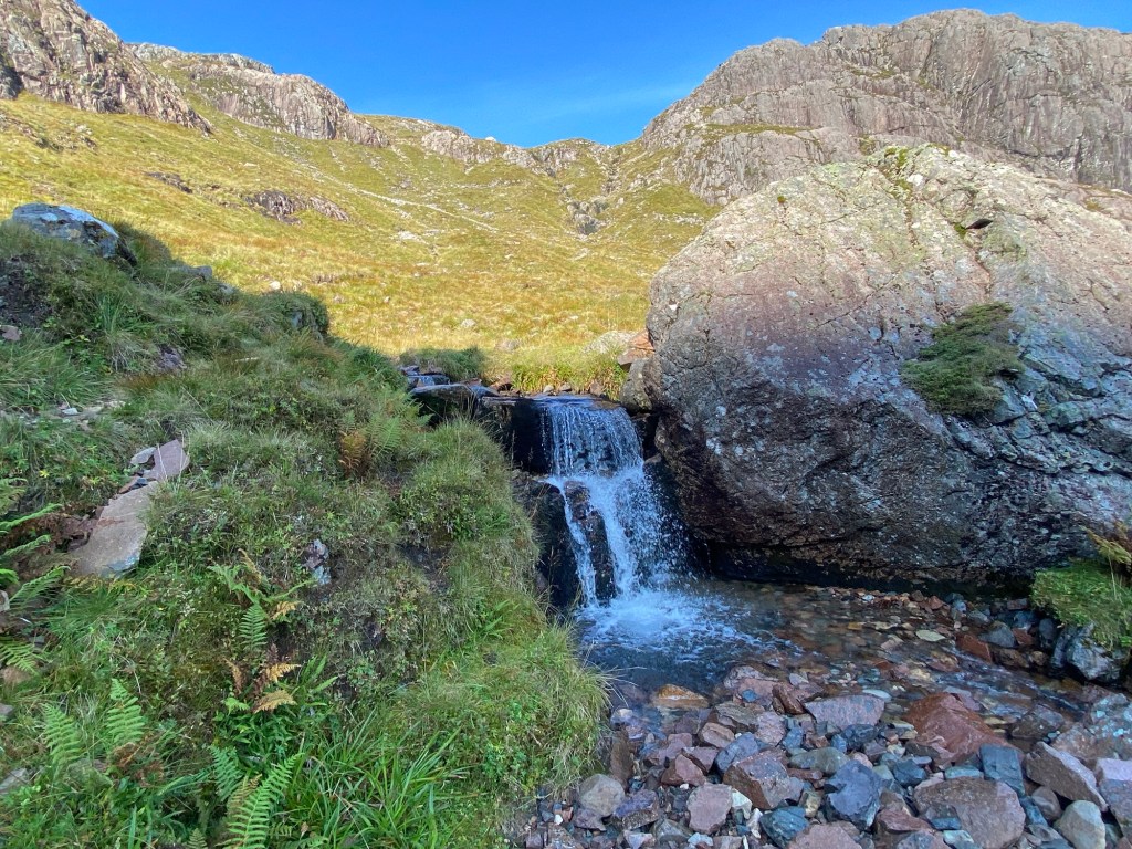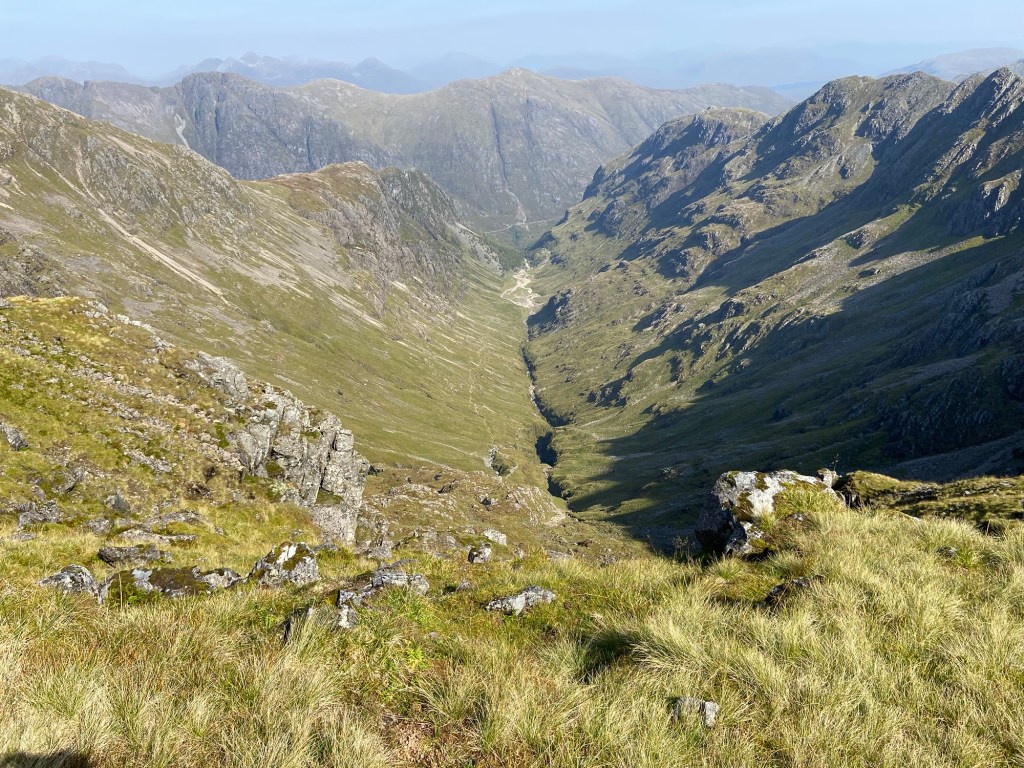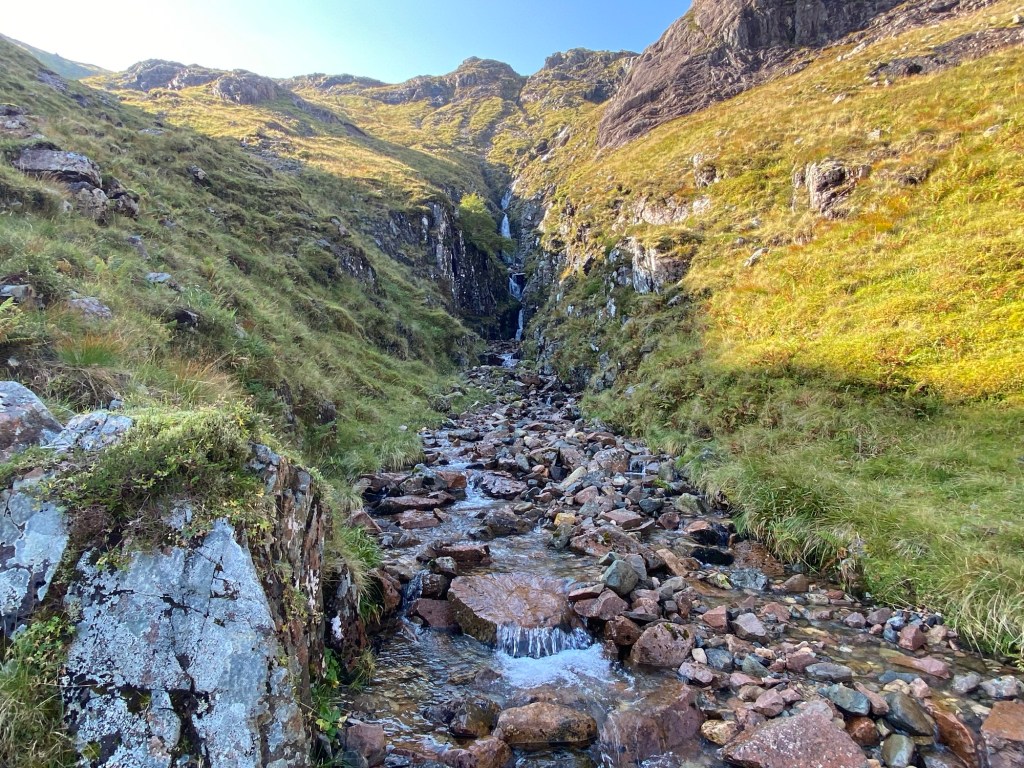 I didn’t spend anywhere near as long on the summit of Stob Coire Sgreamhach as I had on Bidean; having taken my photos I headed back down to the bealach for the final challenge of the day with the steep scree chute leading into the Sacred Valley. Not enjoyable but blessedly brief, before widening into a still steep but less slippery descent – still requiring care on tired legs.