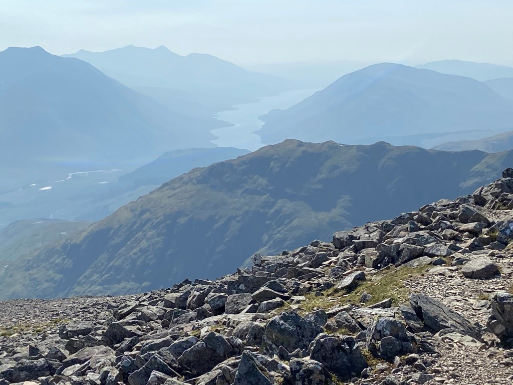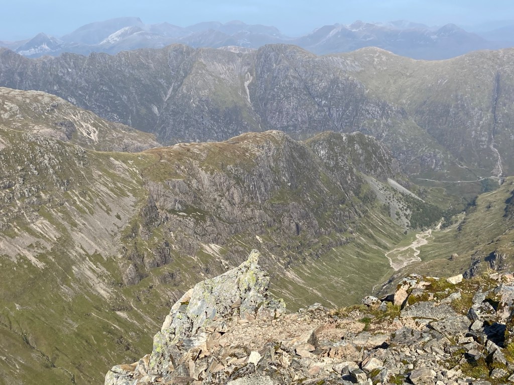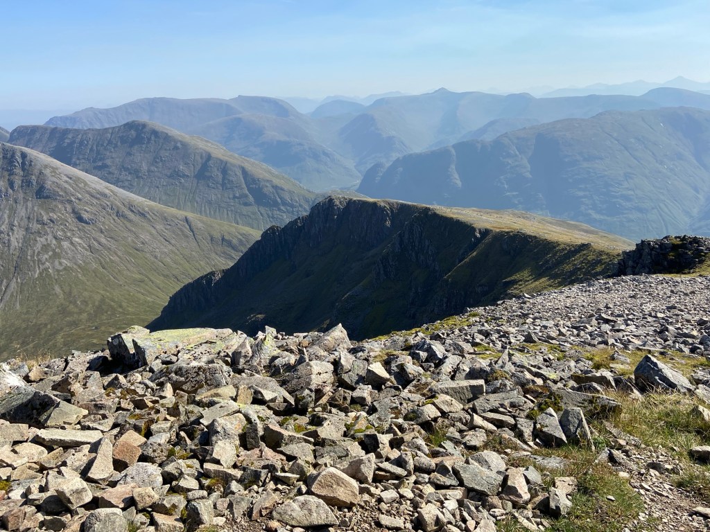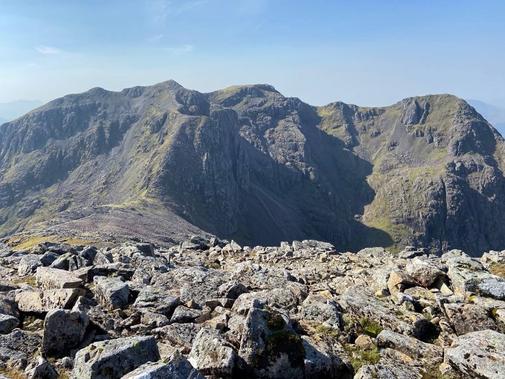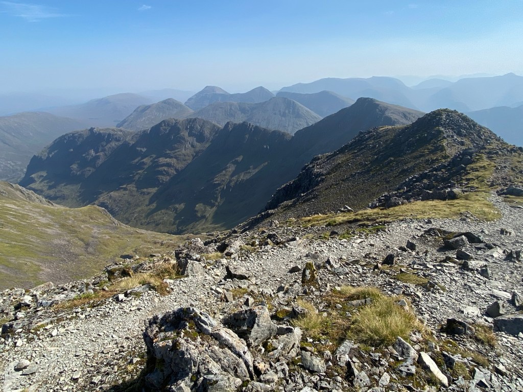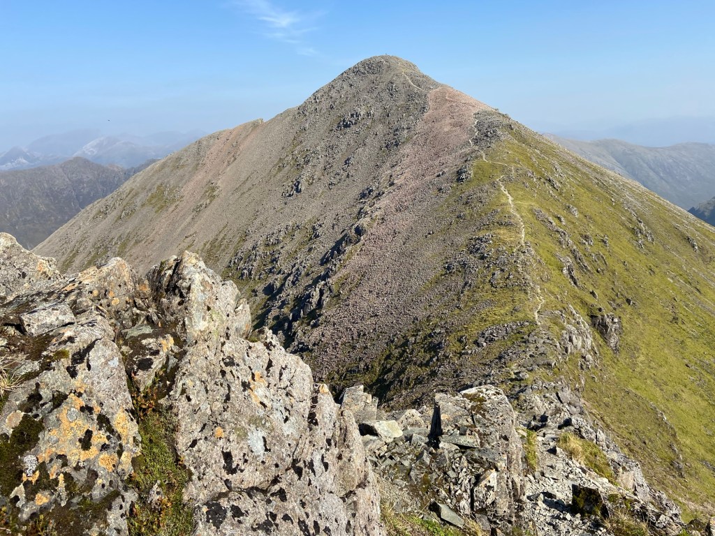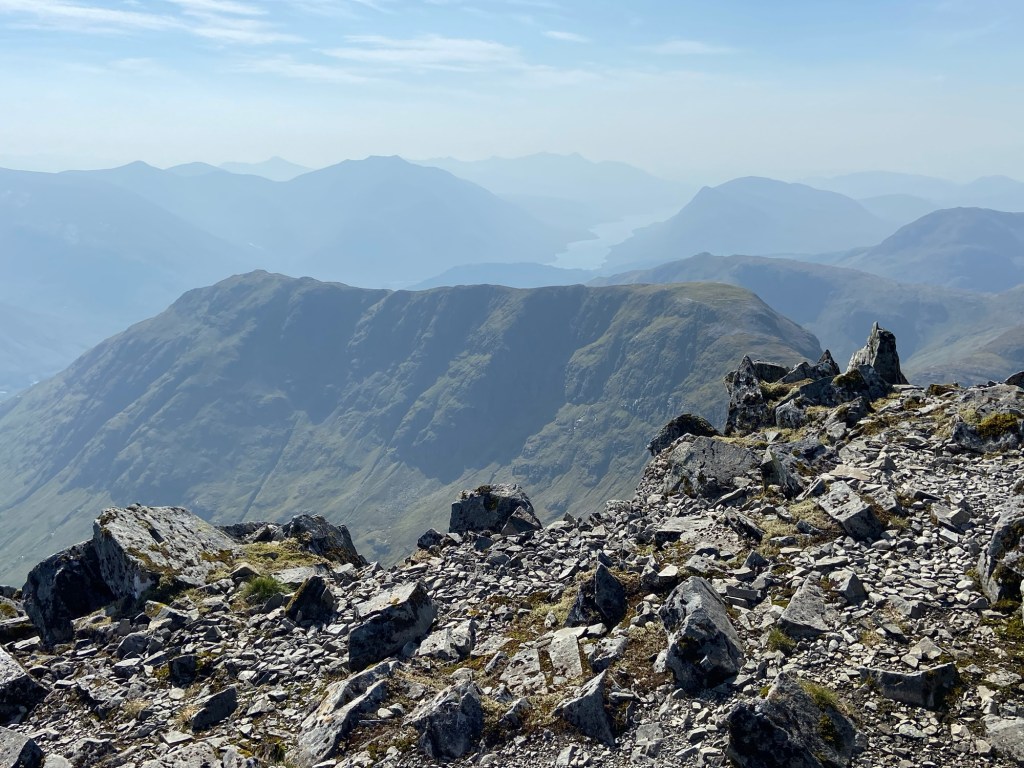 A helicopter was circling overhead as I walked up the lower part of the route – sadly it turned out that it was recovering a body from Stob Coire nan Lochan, of a hiker who had been rteported missing just a few days ago. When I eventually reached the top of Stob Coire nan Lochan, after a long and beautiful hike passing some truly dramatic cliffs, I could completely understand why this route claims so many lives – while there is a clear footpath, the exposure is extreme, and one wrong move could easily see one tumble to one’s death. I took great care on the descent from SCnL to the bealach and on the final semi-scramble up to the top of Bidean.